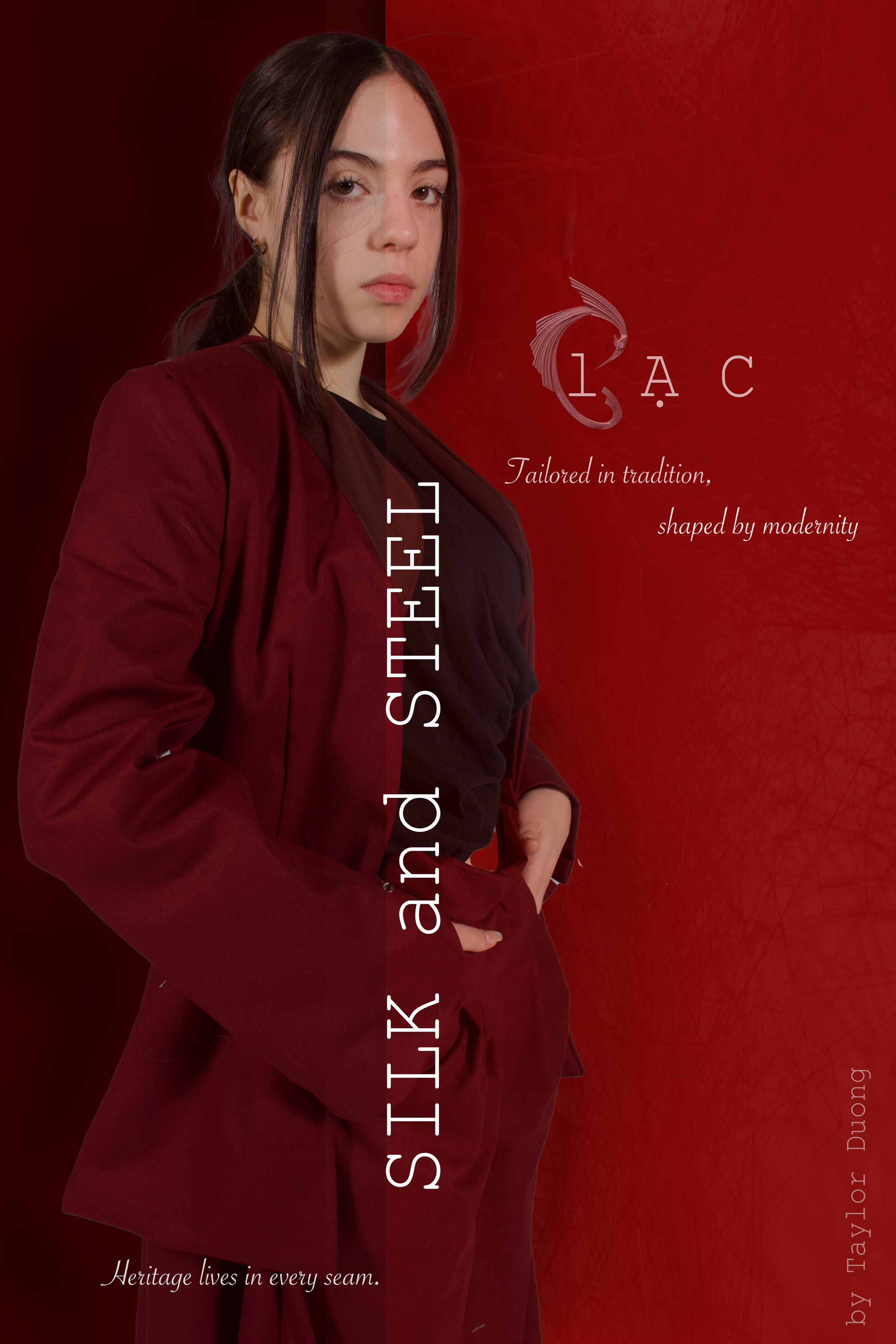 The bird is formed with angular, geometric lines, adding a sense of modernity that pairs seamlessly with the sharp tailoring of the suit. To me, this is the essence of Silk & Steel — a harmony between softness and strength, tradition and transformation.